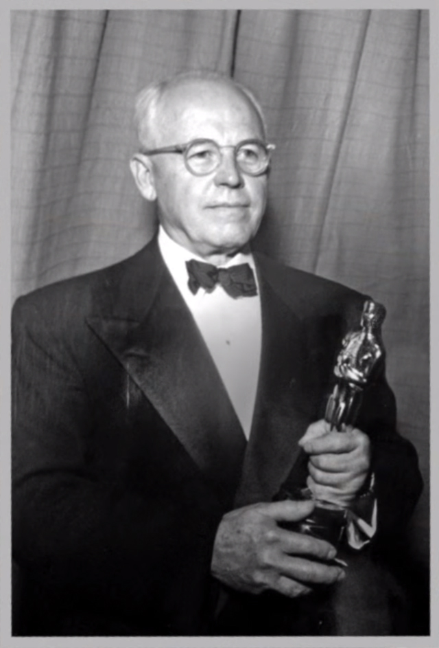 The man holding the Oscar in this photograph is George Mitchell. He won an Oscar for making the Mitchell cameras that shot the movies that won so many Oscars. Hollywood’s highest award was given to a camera maker.